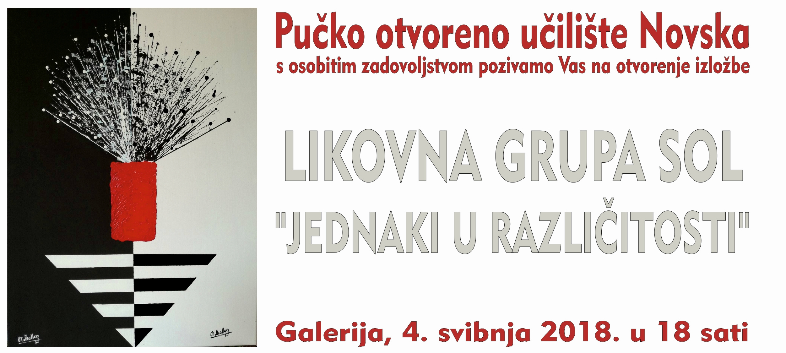 01svibanj IZLOŽBA: “Jednaki u različitosti” Pozivamo Vas na otvorenje izložbe likovne grupe SOL “Jednaki u različitosti”. Otvorenje izložbe će se održati u Pučkom otvorenom učilištu Novska u petak 4. svibnja 2018. godine u 18,00 sati. admin Author